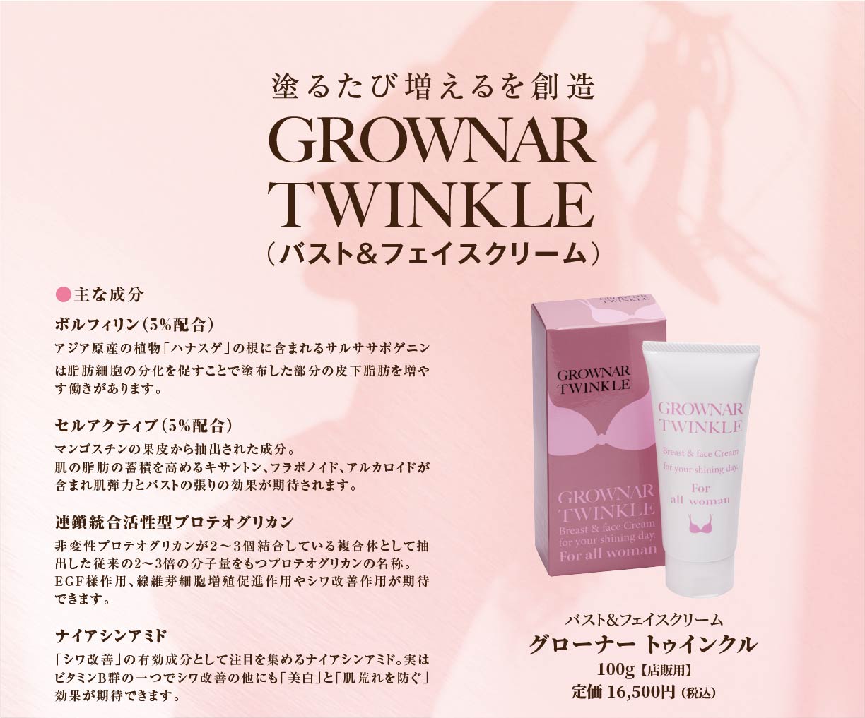 サロン専売品店販商品 grownar twinkle グローナーバストの店販用 こちらもボルフィリン5%、セルアクティブ5%、合計10%配合。フェイスにも使える万能型ホームケア商品。 内容量 100g 店販サイズ サロン価格 16,500円 (税込) サロン価格はお問い合わせください お問い合わせフォーム お問い合わせ内容(必須 複数選択可) デモンストレーション資料請求お問い合わせ 商品名 他に関心のある機器・商品があればお選びください (複数選択可) 脱毛機痩身機フェイシャル機グローナーシリーズ韓国オラクル美容機器化粧品・サプリメント サロン名・会社名 氏名(必須) フリガナ(必須) 郵便番号(必須) 都道府県(必須) 市区町村以降の住所(必須) メールアドレス(必須) 電話番号(必須) 開業年月日 ※これから開業される方は開業予定年月日をご入力ください。 お問い合わせ内容 お問合せフォームにご入力いただきますと、お問い合わせのメールが弊社に届いた旨を知らせる自動返信メールを、お客様にご入力いただきましたメールアドレス宛てに送らせていただいております。自動返信メールがお問い合わせから1時間経っても届かない場合は迷惑メールとして処理されている可能性がございます。「迷惑メールフォルダ」や「削除フォルダ」等をご確認ください。 送信