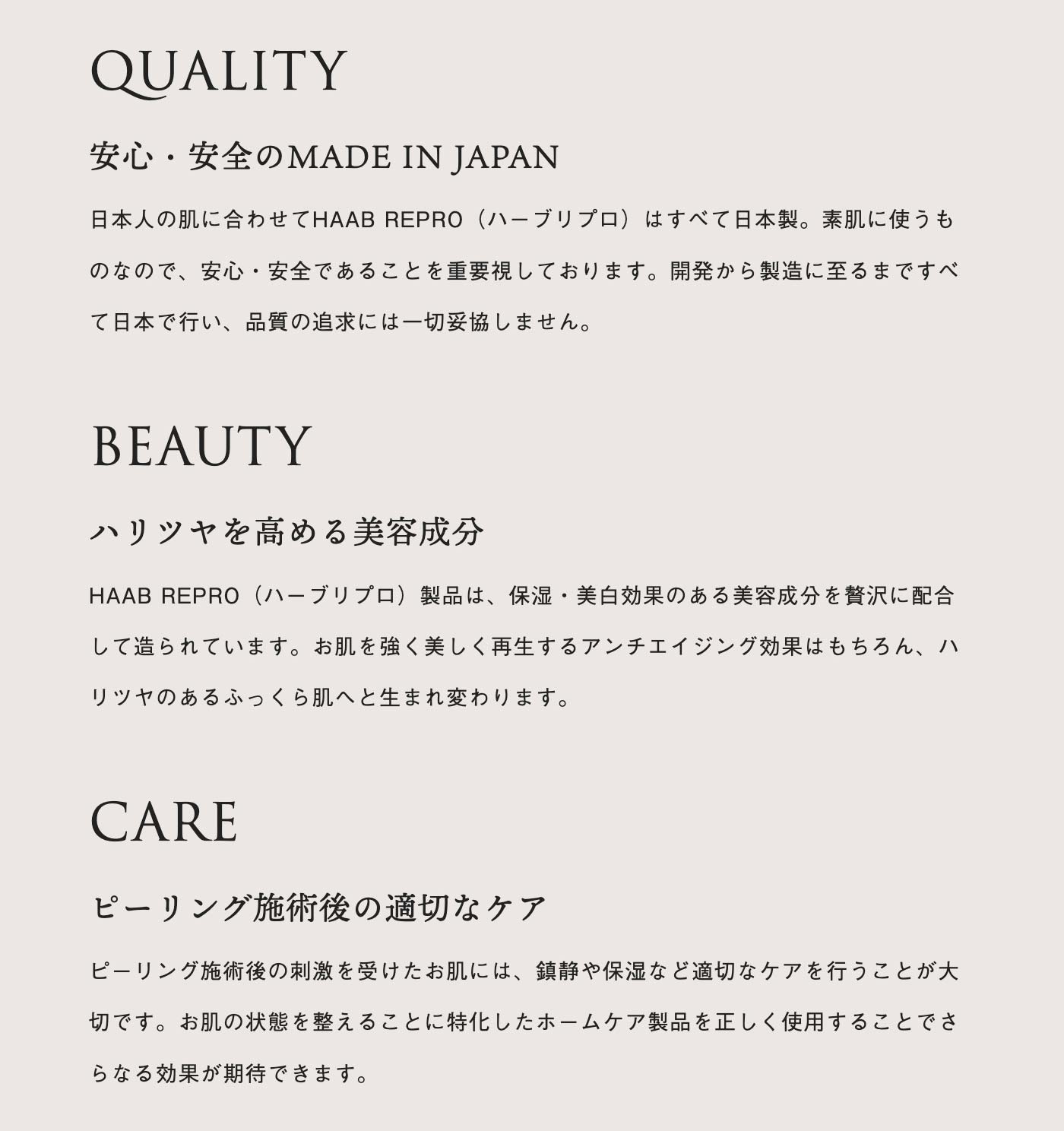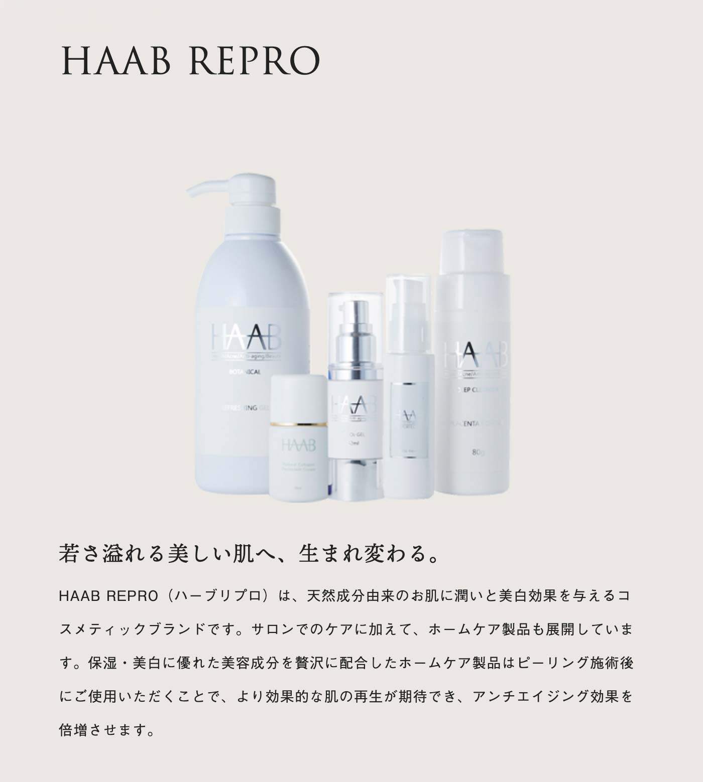 今から15年程前、ピーリングというメニューは一般的ではなく、取り扱いにも不安の多いケアでした。当時すでに美容研究が盛んだった韓国で、世界各国からピーリング商品を集めて研究が行われており、弊社代表の梶千尋がアジア人向けピーリング製品の開発に携わり開発したのが、ピーリング後の肌ケアまで含めシステム化した「HAAB REPRO(ハーブリプロ)シリーズ」です。
